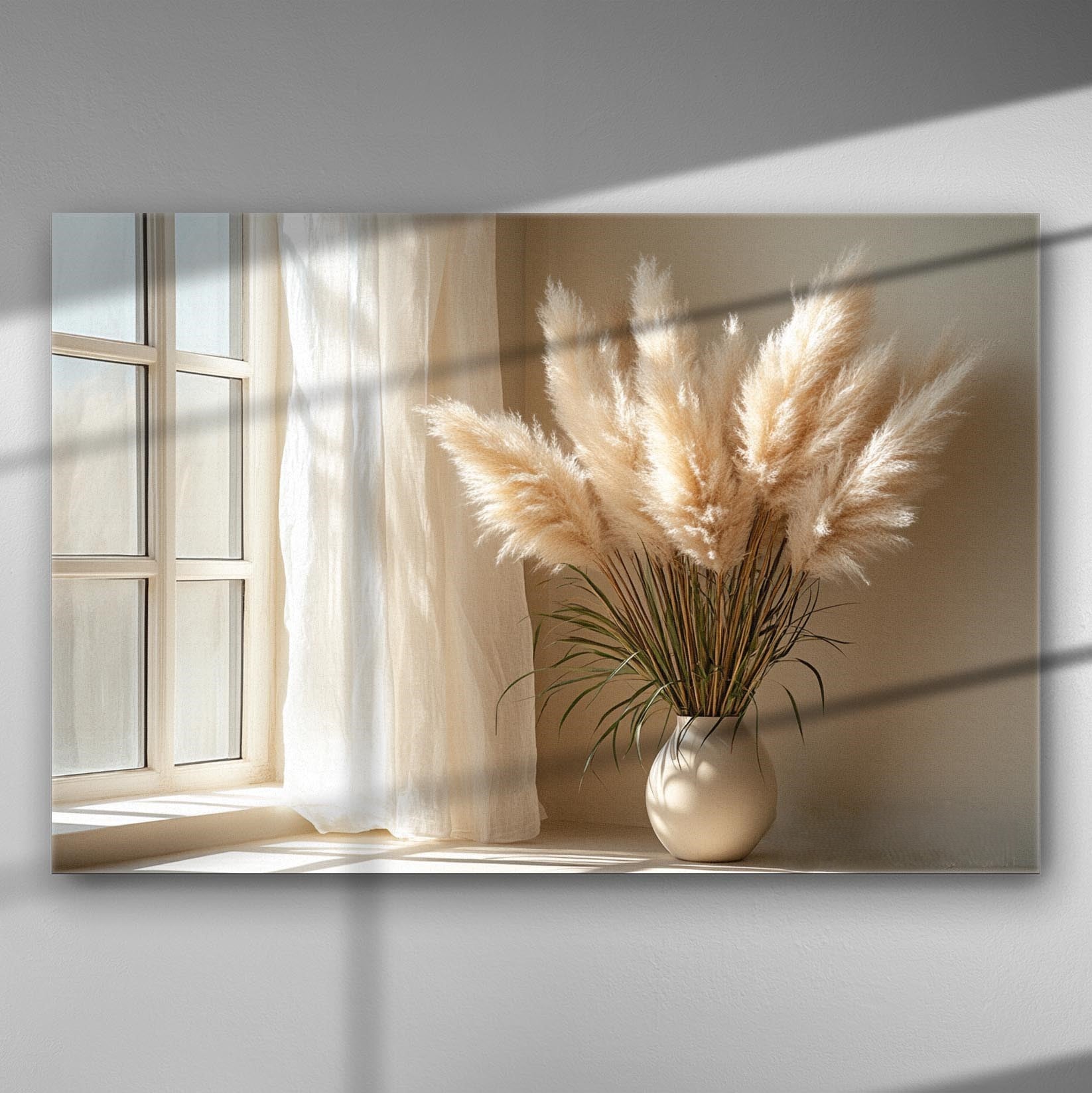 Ανακαλύψτε την απόλυτη ηρεμία με αυτόν τον πίνακα που απεικονίζει ένα όμορφο βάζο με pampas grass, σε φωτεινό παράθυρο που λούζεται από ζεστό φυσικό φως. Η λεπτή υφή των λουλουδιών και οι απαλές αποχρώσεις τους δημιουργούν μια αίσθηση γαλήνης και ηρεμίας.